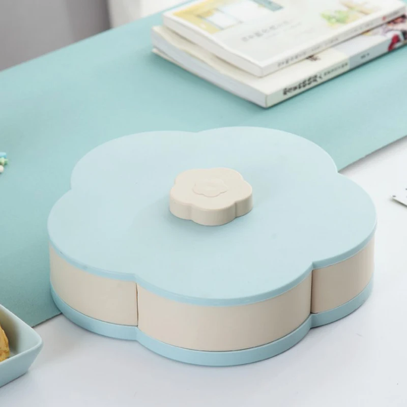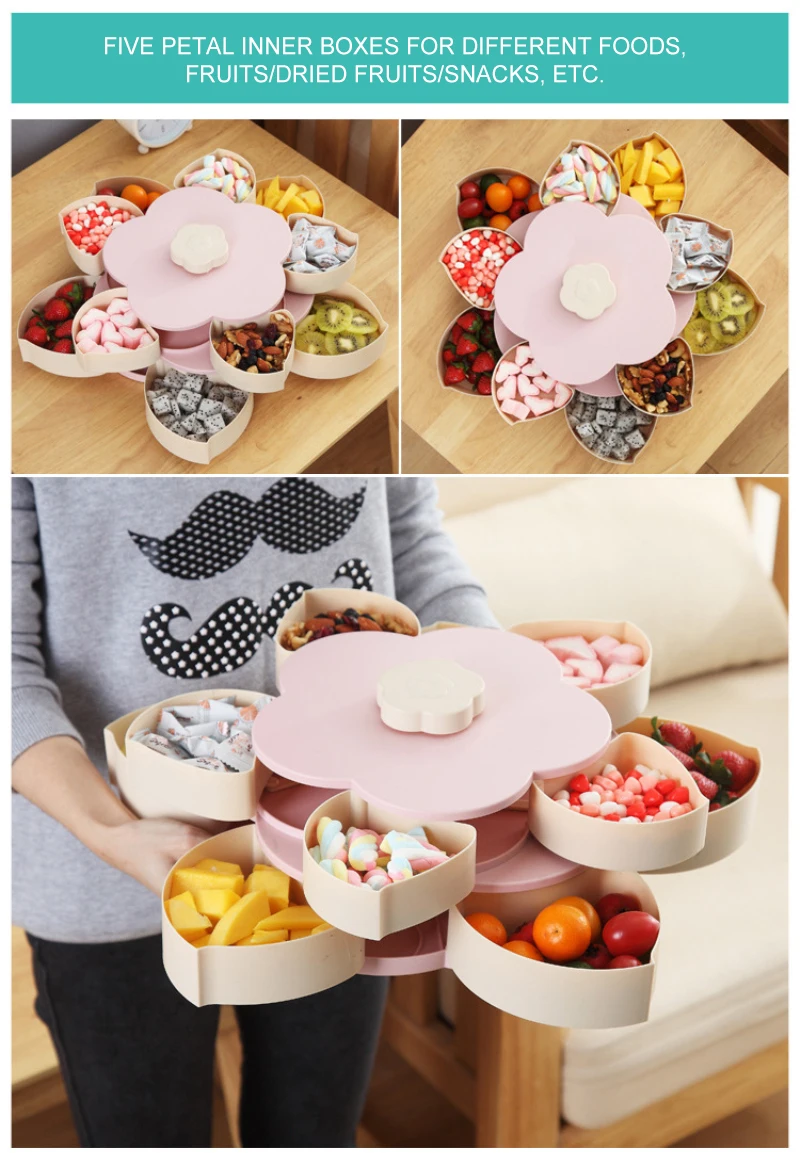 1.elected high quality food grade plastic material, healthy and environmentally friendly, safe and practical. The flower rotating candy box is designed to 10 compartments, can storage 10 kinds of snacks, rich in variety, and food storage is not mixed.