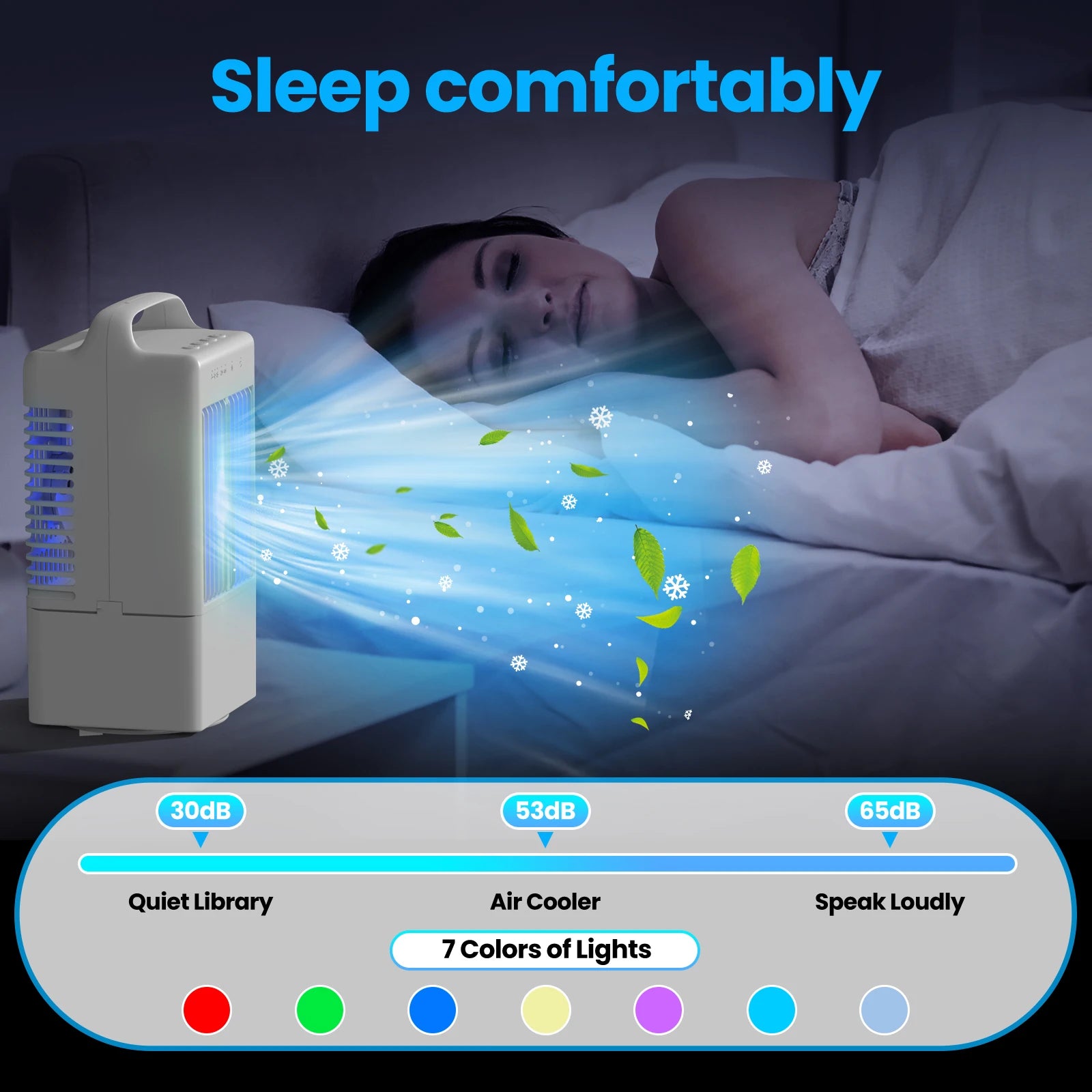 Stay cool anywhere with the Portable Mini Air Cooling Fan, designed to refresh your space using water and ice for enhanced cooling performance. Perfect for desks, bedside tables, offices, and small rooms, it delivers a soft, chilled airflow that improves comfort during hot days.