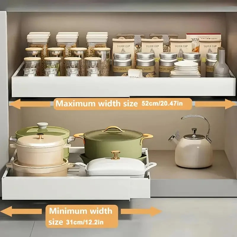 Upgrade your kitchen storage with the Pull-Out Cabinet Storage Rack, designed to bring convenience and organization to your cabinets without any drilling or permanent installation.