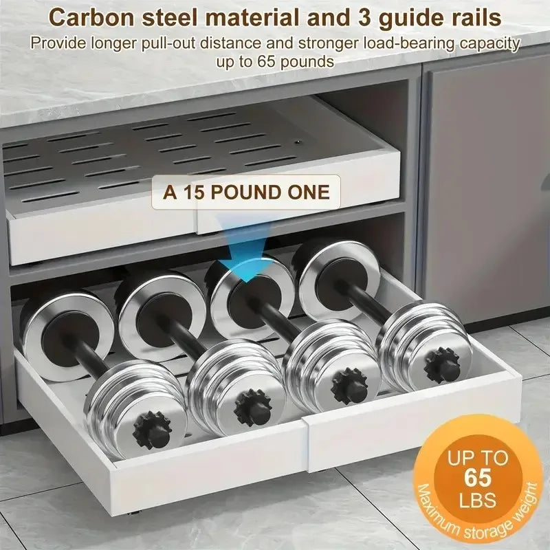 Equipped with 3 silent slide rails, this rack glides smoothly in and out, giving you easy access to spices, tableware, cleaning items, and pantry essentials. The durable metal structure ensures long-lasting use, while the no-drill installation makes it perfect for renters, small kitchens, and anyone seeking quick organization.