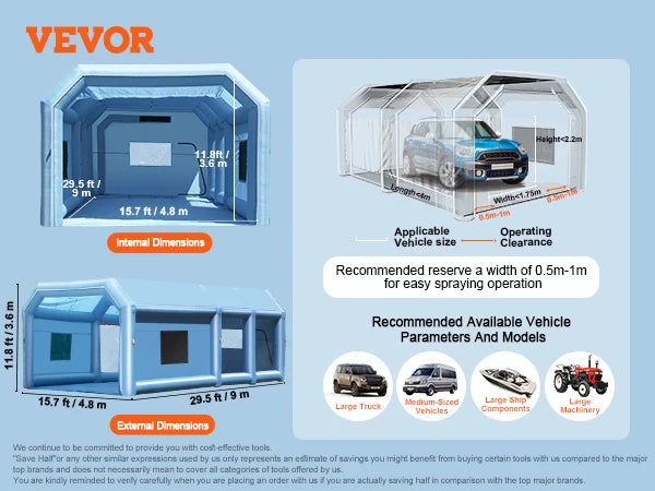 Built from high-strength Oxford cloth with transparent windows and a dual-layer filtration system, it ensures clean airflow, VOC reduction, and superior paint quality. The booth inflates within minutes using the included high-powered blowers, and must remain running during painting and drying for optimal air pressure and safety.